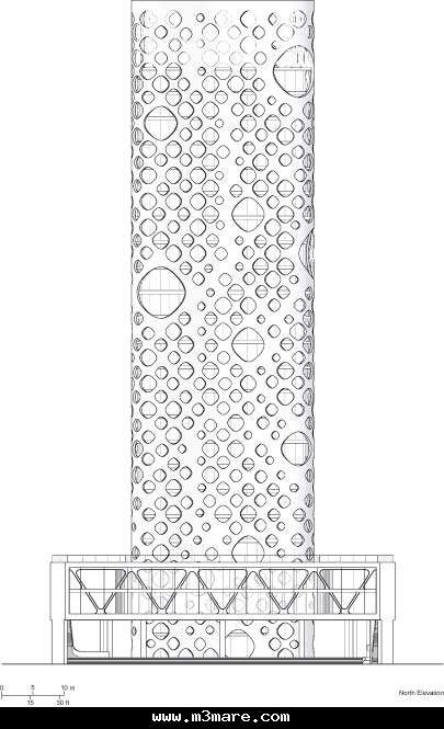 ولقد قام المعماري Jesse Resiser بالاشتراك مع المعمارية Nanoko Umemoto من شركة RUR بتصميم البرج في العام 2007 ومن المتوقع أن تتجاوز ردود الأفعال في الأوساط المعمارية إثر الكشف عن O-14 تلك التي رافقت الإعلان عن تصميمه ويحظى هذا البرج وعلى الرغم من زحمة أبراج دبي بواجهةٍ مثيرة للإعجاب بمقدورها أن تحد من الاكتساب الحراري بالإضافة إلى وجود نظام تبريدٍ متطور قادر هو الآخر على خفض استخدام الطاقة وليس هذا كل شيء فقد أضفت هذه الواجهة على O-14 مظهراً نحتياً أنيقاً والفضل لفتحاتها الدائرية الكبيرة التي بلغ عددها الألف لتكون بمثابة هيكل خارجي مفرغ ومن جهتها ساهمت هذه الكتلة بتدعيم كتلة البرج الأساسية ناهيك عن جعل المساحات الداخلية المكتبية مفتوحة على الخارج على نحوٍ ملحوظ أما المساحات الداخلية فيمكن تقسيمها على النحو الذي يرغب فيه المستأجر فقد تم تصميمها دون أية أعمدة فقط مساحة حرة ومفتوحة ويسترعينا هنا المتر الوحيد الذي يفصل الكتلة الخارجية عن الكتلة الأصلية حيث يخدم هذا الفاصل بمثابة قناةٍ منحدرة للهواء الساخن آخذين بعين الاعتبار الأحوال الجوية السائدة في دبي كمدينة صحراوية قام فريق RUR بتصميم الكتلة الخارجية لإخراج الهواء الساخن من الأعلى إلى الخارج عدا عن كونها درعاً لحماية البرج من أشعة الشمس الحارقة مما يوفر المال والطاقة فيما يتعلق بتبريد المساحة الداخلية يُذكر أن توجيه الفتحات في الواجهة خضع لدراسة دقيقة قبل التنفيذ فلم تكن مجرد دوائر عشوائية خُطت على جسد الكسوة بل كانت عبارة عن نوافذ حقيقية على عمارة دبي المحيطة تحول دون التأثر بحرارة وأشعة الشمس المباشرة أما طوابق O-14 الحادية والعشرين المفتوحة على الخارج فسوف تكون عبارة عن مكاتب في حين سيشغل الطابق الأرضي مركز تسوق فاخر ومدخلاً إلى الممشى المائي.