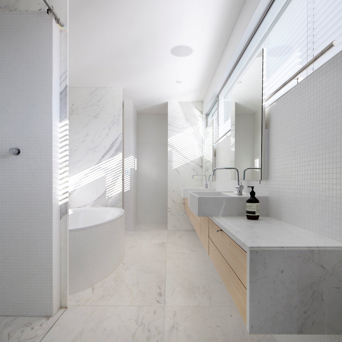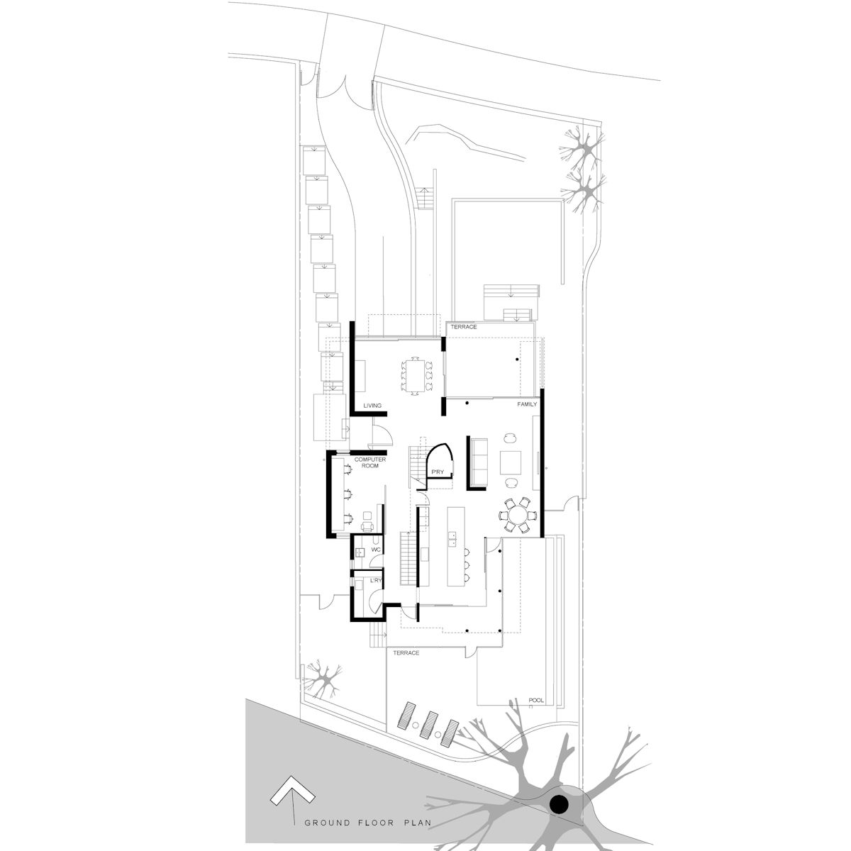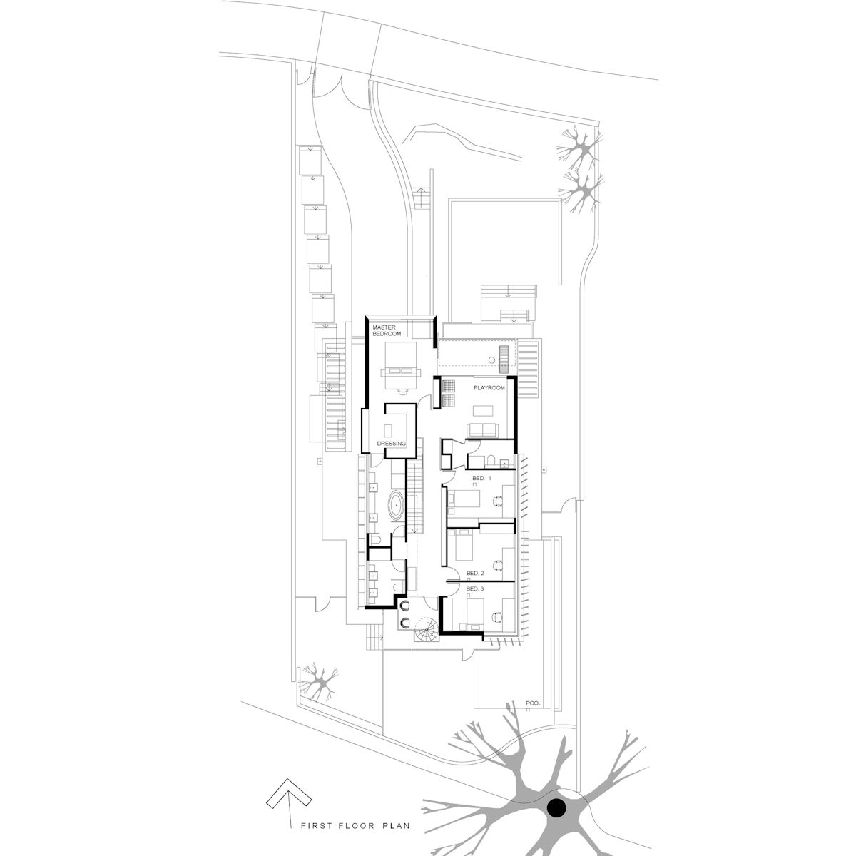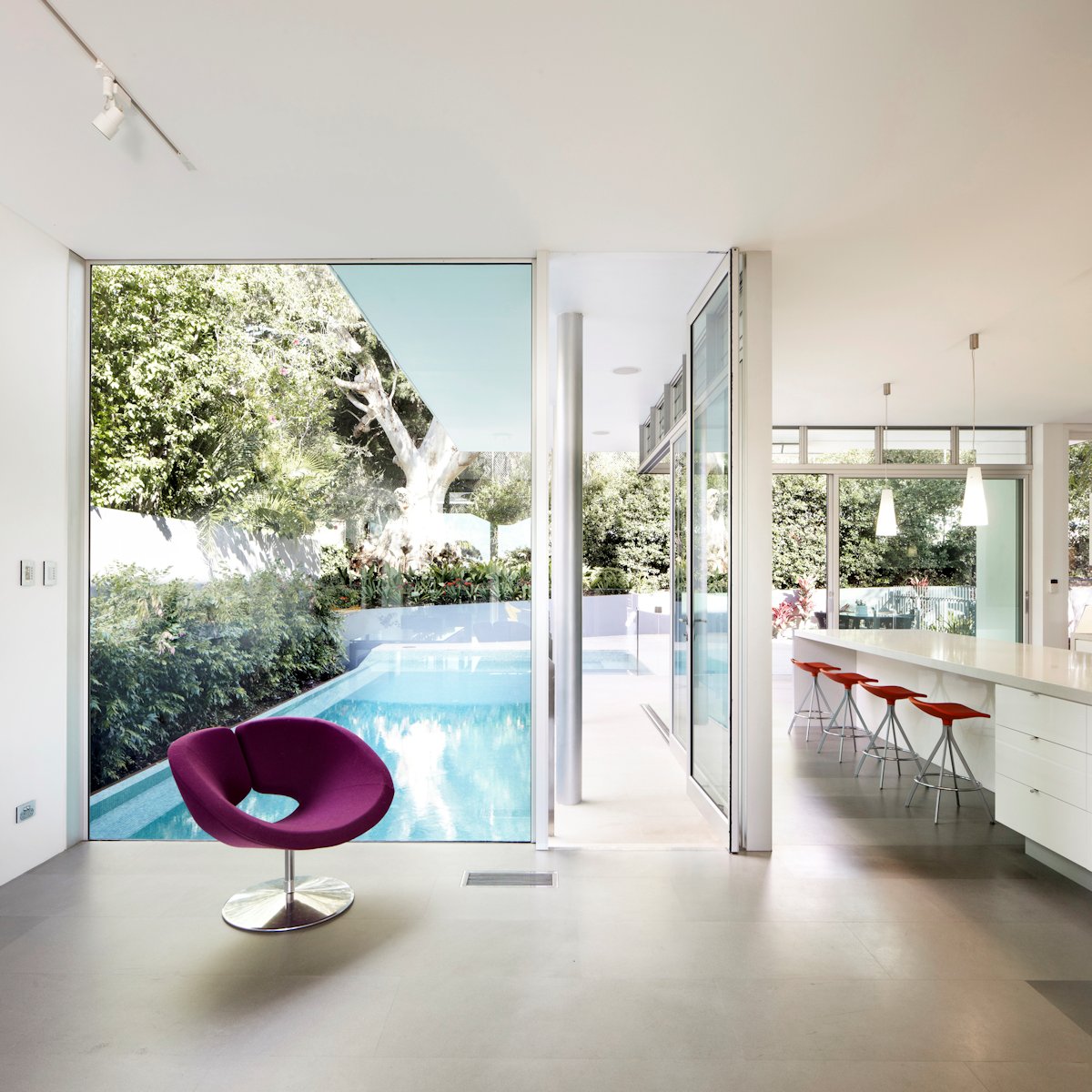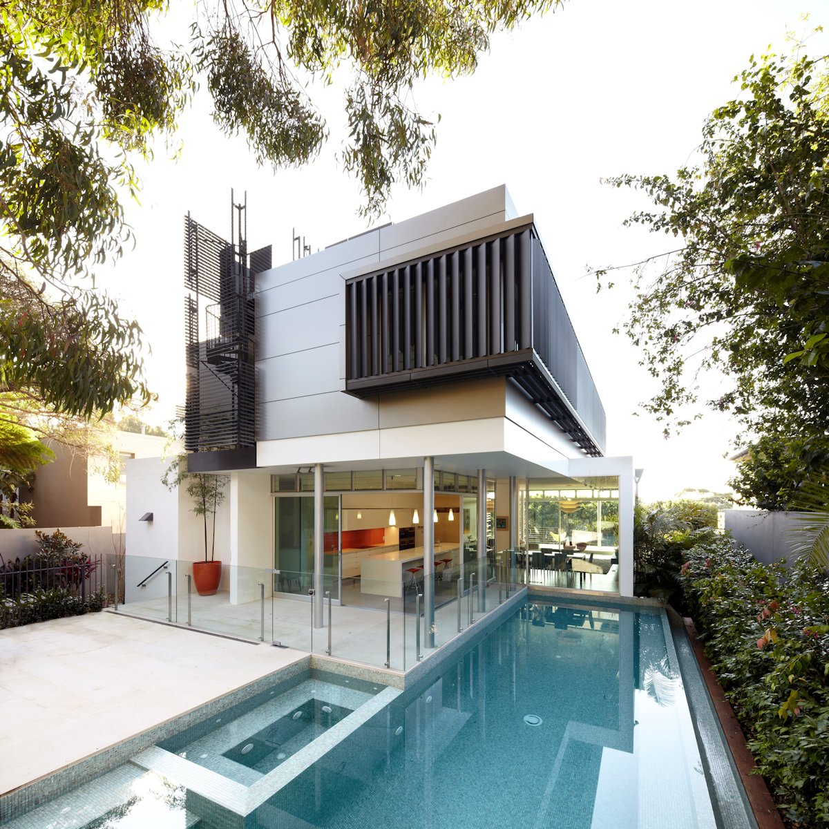 This building takes full advantage of being on the sunny side of the street. Where sun access and vistas to Sydney Harbour are the same you have to embrace it. Three levels of the building topped with a roof terrace create dramatic composition above the street that is controlled by interplay of horizontal elements. Unusually for houses in the surrounding suburb, part of the outdoor functions are in the street frontage and above the street, rather than being hidden behind high fences. The Ground Floor is partially suspended. Connecting garden stairs and terraces are sandstone slabs lightly supported to emphasise position elevated above the ground levels.The composition of the rear garden is controlled by the dominant presence of an old gum tree providing protected habitat for birds and with its form displaying beautiful shapes and colours of the trunk. The main Family Area at the ground floor level is positioned to benefit from both: distant northern views towards the harbor and intimate views to the gumtree. With the change of lighting, the distant views dominate during the daytime and intimacy of the gumtree takes over in the evenings.External sandstone slabs change internally to much finer sandstone for the floor and coarse sandstone of wall cladding relates to the entry point. Timber used internally counterbalances stone finishes, slick metal cladding to Master Bedroom and solid steel plates to roof terrace. The building displays large transparency, while maintaining sufficient mass to provide feeling of sound shelter. Simplicity of spaces is enriched by fine detailing of timber and steel elements.